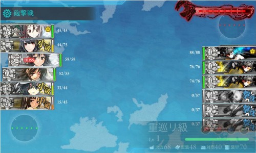 開幕雷撃に当たるかどうかが勝負の分かれ目のようです。とにかくみんな無事でボスにたどり着くこと、を第一に考えての出撃となりました。最初の二戦はな、S勝利でいってやれ!とか思ってたんですが、無理無理w
