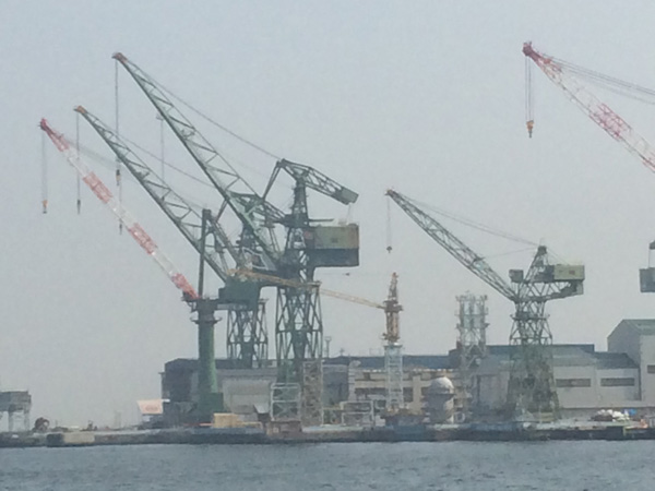 豚まんから離れない頭を切り替えて、まずは観光です。川崎工廠…もとい川崎造船所を見るため、埠頭へ向かい突端に突撃。海風は気持ちいいですが、くっそ暑い。