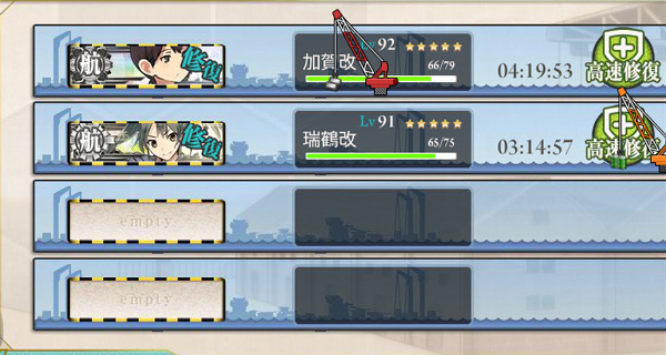 そろそろ3-5を削りきっておかないと末日になってしまう、と慌てて最後の削りに行きました。首尾よく削れて勲章はゲットできたのですが、出撃していた加賀さんと瑞鶴が小破。明石さんに修理をお願いしていたのですが、帰宅してみたらやっぱり正規空母です。修理が終わっておりませんでしたので、ドック入りさせました。
