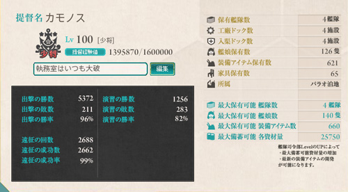 というわけで、とうとう司令部レベルが3ケタになりました。ある日突然なっていて、てーとくびっくりです。ついうっかりうちの秘書艦に確認したら、どうでもいいから夜戦しろと一蹴されました。ブレない秘書艦です。