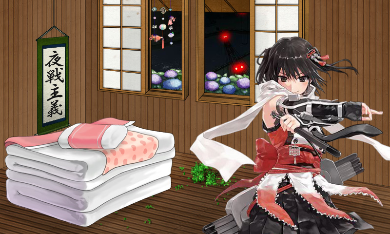 @執務室。夜戦主義の掛け軸がきらめいています。完全に天井から降り立った忍者っぽい。