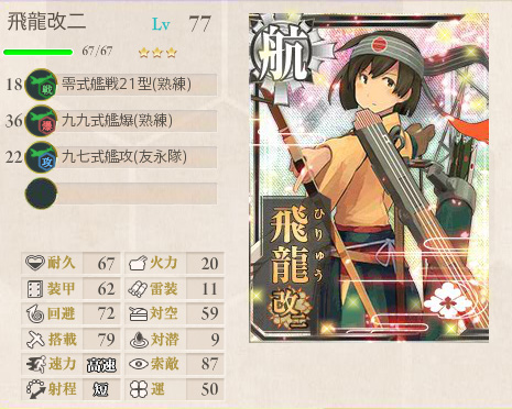 二週間前には40弱だった飛龍ちゃん。捕鯨している間に、すくすく育ちまくりました。てーとくびっくりです。まさか今週改二までいけるとは、予想だにしておりませんでした。