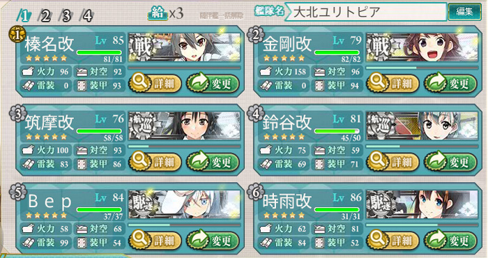 キラ付け必須で行ってみたら、大破撤退は金剛が1回あったきりでなんとかなりました。しかし大破撤退と言えば鈴熊のお家芸なはずなのに、今回は中破止まり。バルジか?バルジがええのんか?