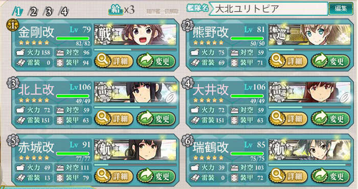 そして勢いで5−4。ひと区切りっぽい海域ですし、たまには艦隊名に偽りない状態にしたいものです、ということで、大北を入れてみる。比較的楽に抜けられるという空母2隻ルートのため、赤城さんと瑞鶴に参加してもらいました。加賀さんじゃない理由は、まあ瑞加賀だからですよ。はやく追い付かせてあげたいってやつです。