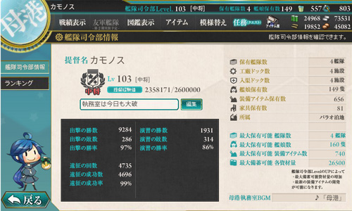 大型建造でしおいちゃんチャレンジした(失敗)&二隻急速レベリングのため、備蓄が微妙に溶けています。鉄とボーキはともかく、イベントまでに燃料と弾薬をどうにかしないと。