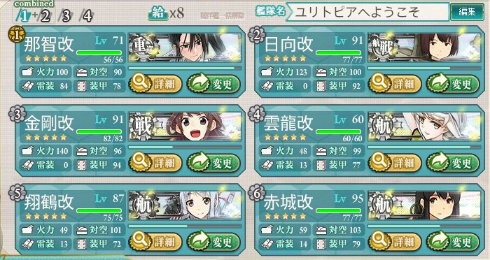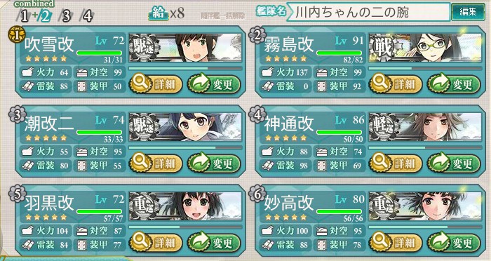 重巡も足柄さんとか摩耶姐さんではなく、妙高型中心で。E3でも高雄型で行ってましたが、重巡は70あればなんとかいけるっぽい。