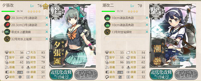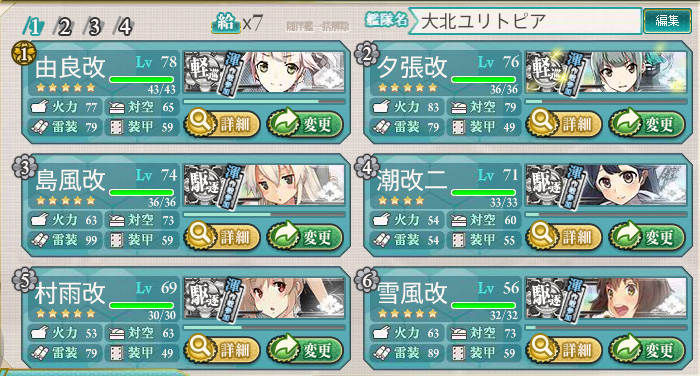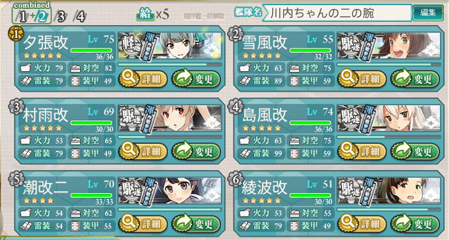 面倒だったので、E-1の水雷戦隊をそのまま…と思いましたが、綾波は少し不安だったので、夕張にチェンジして出撃です。装備もほとんど変わりませんが、電探と艦載機は少し気を遣ってこうなりました。
