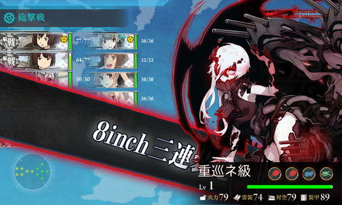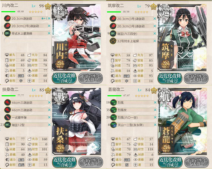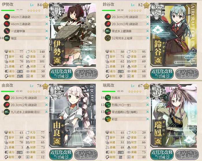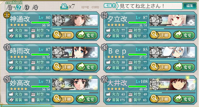 この人、出番多いな…。と呟いたボス戦。ただ、前回のE-6の時より、格段に柔らかかったです。最後なので、簡単に記録を。陣形は全て第四でした。