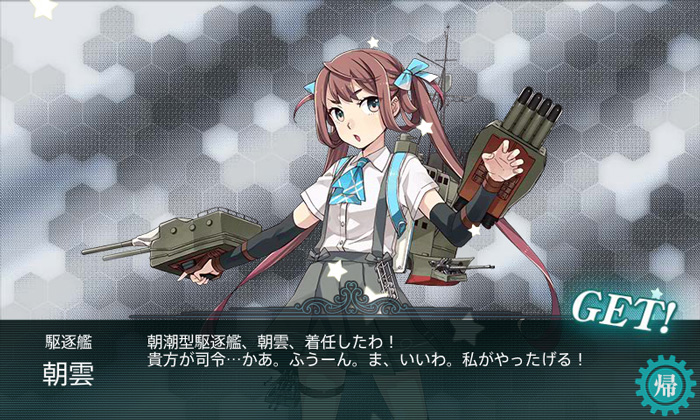 朝雲ちゃん以外のドロップが…。今回も渋いな。E-1で鯨とか明石とか掘れるらしいので、原稿の合間にちょこちょこ行ってみようと思います。