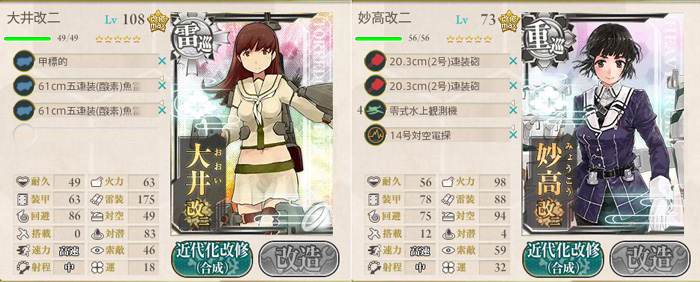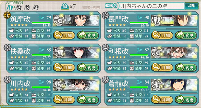水上打撃部隊と水雷戦隊の連合艦隊、ということで。攻略サイトも参考にしながら、とりあえず組んでみました。