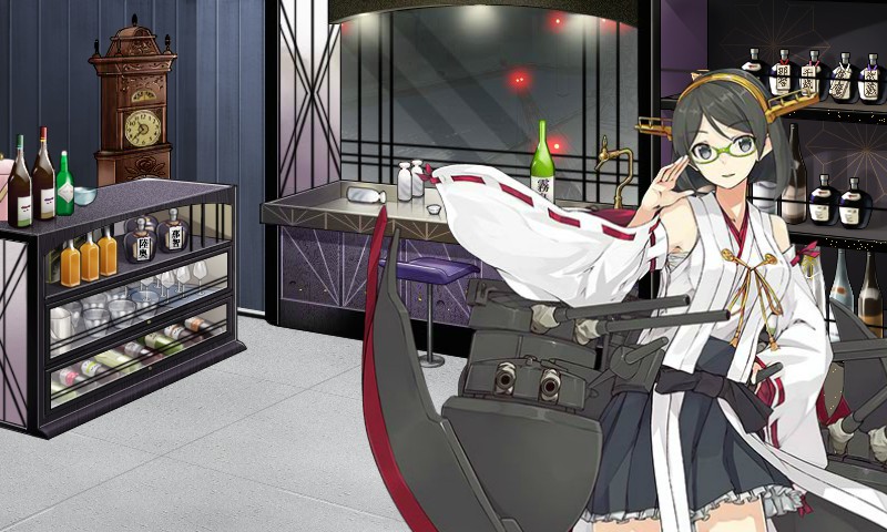 霧島の袖のせいで見えづらいですが、後ろにある酒瓶は霧島。時間や艦娘によって変わるようで、ビールがおいてあることもありました。そう言えば、右端のこのビールサーバーっぽいものはどこに繋がっているんだろうか。
