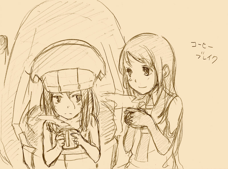 五月雨ちゃんと仲良くコーヒーブレイク。でもホ級はちょっと警戒気味な感じで。ホ級はブラックがお好きだそうですが、五月雨ちゃんは多分ミルクと砂糖入り。コーヒー自体はバリィさんのところで結構飲んでると思う。